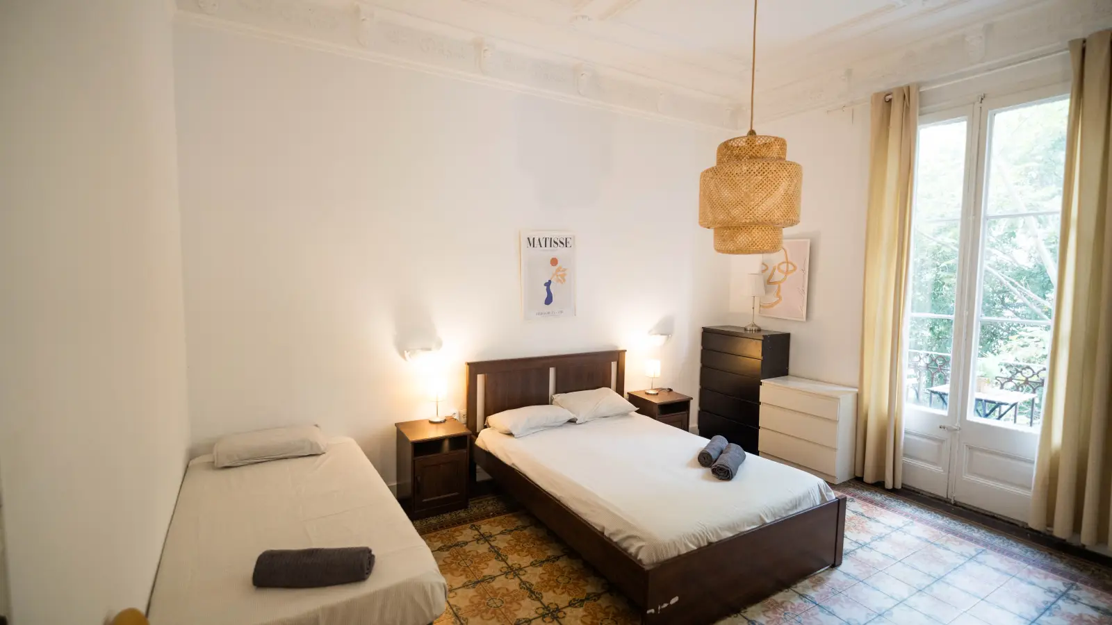 This is one of the largest rooms in the apartment, designed to host up to three people comfortably. It offers a double bed, a single bed, both with linens, a functional desk and a window facing the street that brings in plenty of daylight. The room includes towels, WiFi, a private key and essential amenities. The shared kitchen is suitable for simple meals, and the bathroom is also shared among guests. Its spacious layout makes it comfortable for longer stays, offering both practicality and privacy.