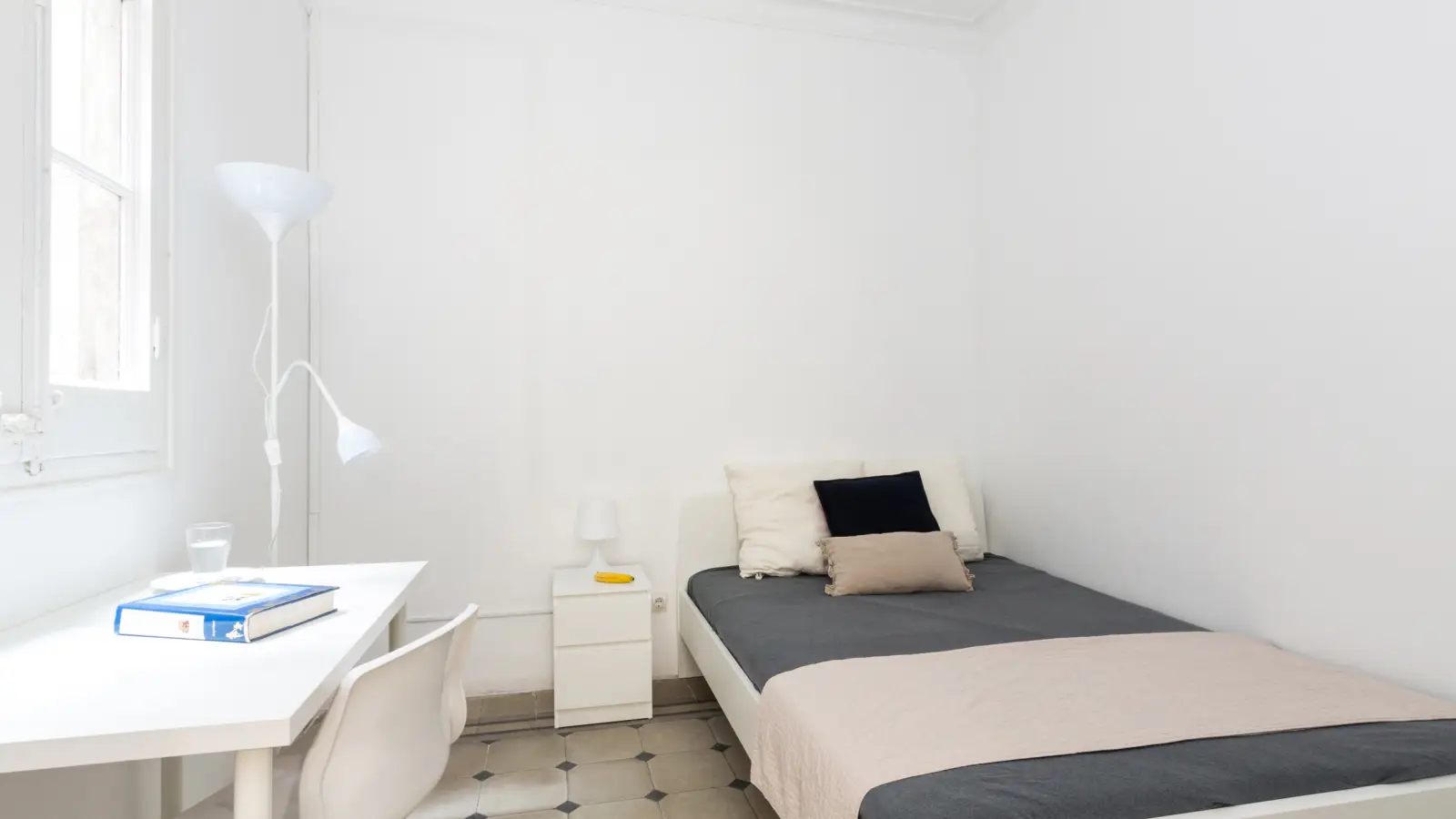 Step into this spacious and furnished room located in a shared 6-bedroom apartment in Sant Antoni, Barcelona. The apartment is equipped with an elevator for convenience, features a well-equipped kitchen, and includes shared access to a washing machine and an oven. Bills for electricity, water, gas, and WiFi are fully included. Spotahome landlords undergo comprehensive vetting to ensure quality standards.