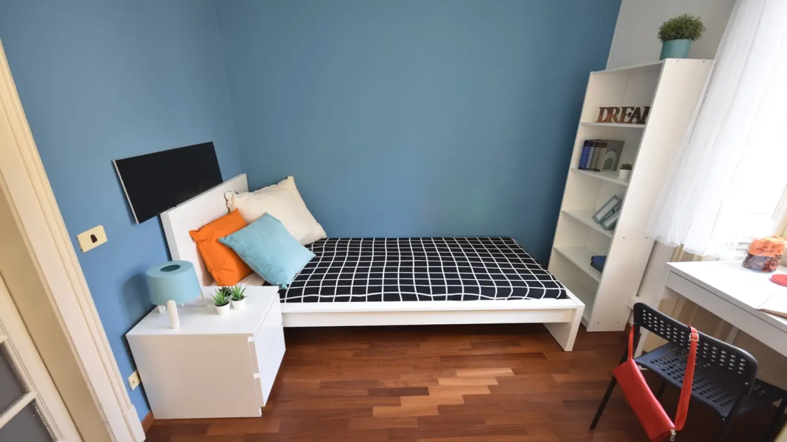 Zona Centro, posizione strategica e di assoluto pregio ai piedi della funicolare per la città alta, si affitta una bellissima stanza standard ristrutturata appositamente per offrire comfort e comodità ai nostri studenti. La stanza è dotata di letto singolo, armadio 3 ante, scrivania con portaoggetti, comodino, tendaggi, specchio, poltrona e libreria. I colori delle pareti favoriscono il buon umore e aiutano nello studio.