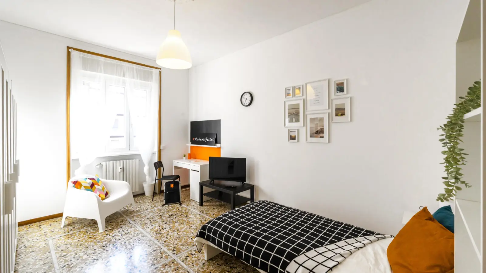 Zona Centro, posizione molto tranquilla, si affitta una bellissima stanza singola, Suite, ristrutturata appositamente per offrire comfort e comodità ai nostri studenti. La stanza è dotata di TV, letto singolo, doppio armadio 3 ante, scrivania, 2 comodini, specchio, scarpiera, libreria, poltroncina. I colori delle pareti favoriscono il buon umore e aiutano nello studio.