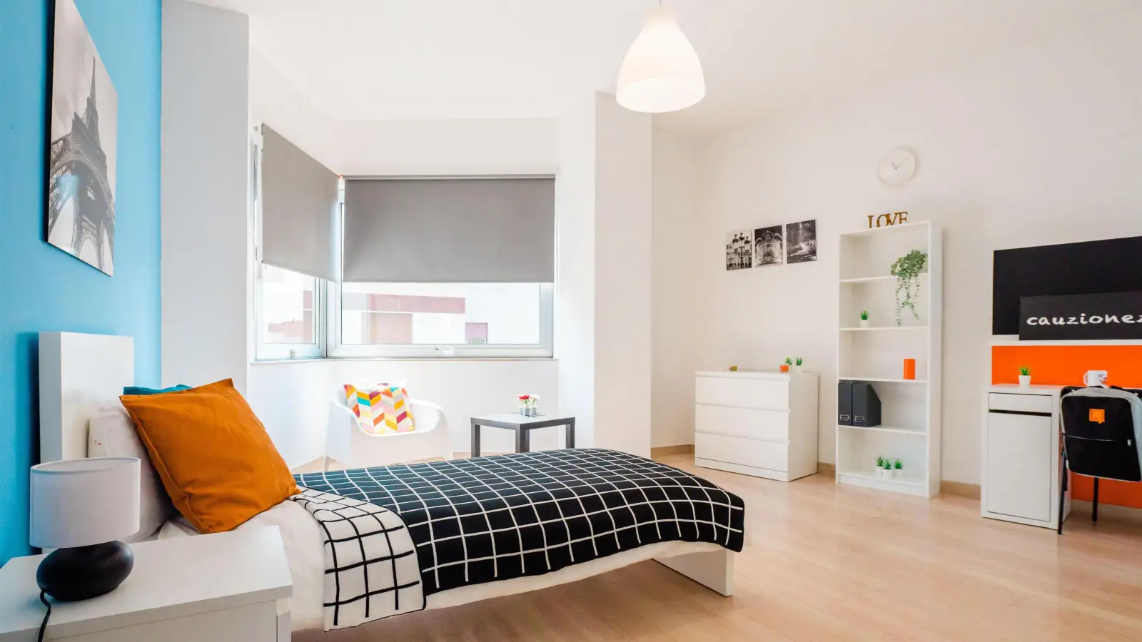 Zona Centro, bellissima stanza singola, ristrutturata appositamente per offrire comfort e comodità ai nostri studenti. La stanza è dotata di letto singolo, 2 comodini, 2 armadi, scrivania, specchio, 2 scarpiere, libreria, cassettiera, poltroncina con tavolino. I colori delle pareti favoriscono il buon umore e aiutano nello studio.