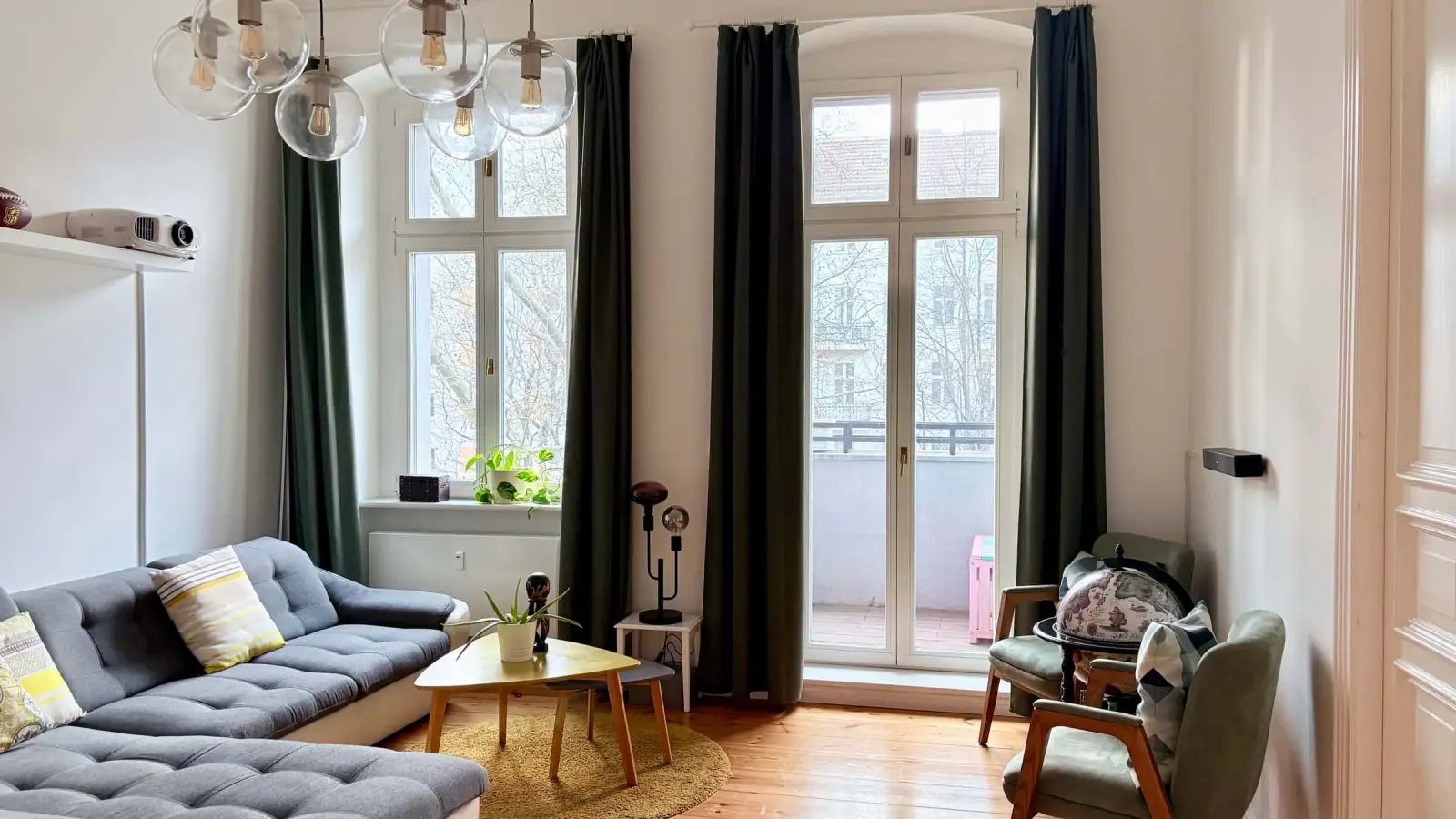 Die Wohnung besticht durch helle Räume mit hohen Decken, große Wohn- und Küchenbereich sowie einer Kissenecke. Die Küche ist voll ausgestattet, das Bad hat sowohl Dusch als auch Bademöglichkeiten. Und die Arbeits- und Schlafzimmer liegen ruhig zum Innenhof. Die Wohnung ist in der besten Lage im Herzen von Friedrichshain – nur wenige Schritte vom Boxhagener Platz entfernt, umgeben von lebendigen Cafés, Restaurants und einer hervorragenden Anbindung an den öffentlichen Nah- und Fernverkehr.