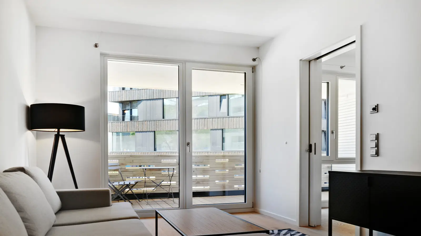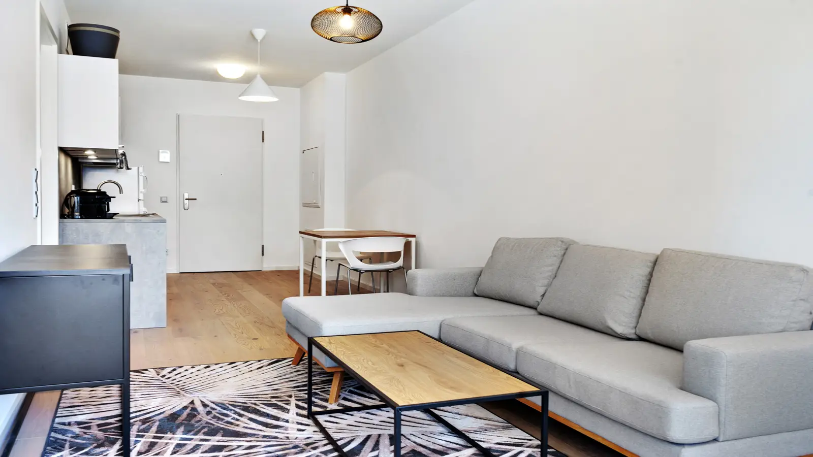*Double bed 1,60 m wide and bed linen *Wardrobe 1.80 m wide *2x small bedside tables with 2x table lamps *Open wardrobe *Washing machine *iron, ironing board, clothes horse, vacuum cleaner *3er Norwic Sofa (L shape) *1 x coffee table *1 x floor lamp *1x carpet * Kitchen table and 2x chairs *Lamps and curtains * Toaster, electric kettle, Nespresso coffee maker, kitchen utensils *Balcony table and 2x chairs * Kitchen with stove and oven, refrigerator