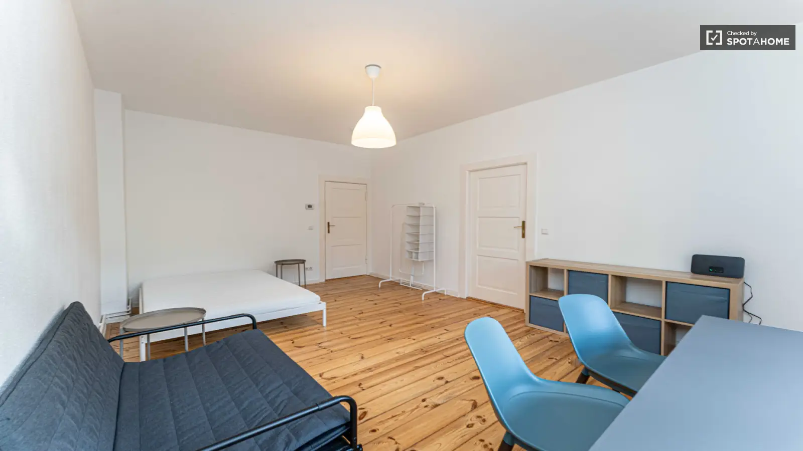 Looking for a cozy shared living space in Berlin? This furnished room within a shared 3-bedroom apartment offers a comfortable living environment complete with a washing machine for private use and an oven. Enjoy an exterior layout that brings in natural light, making it pleasant and bright.