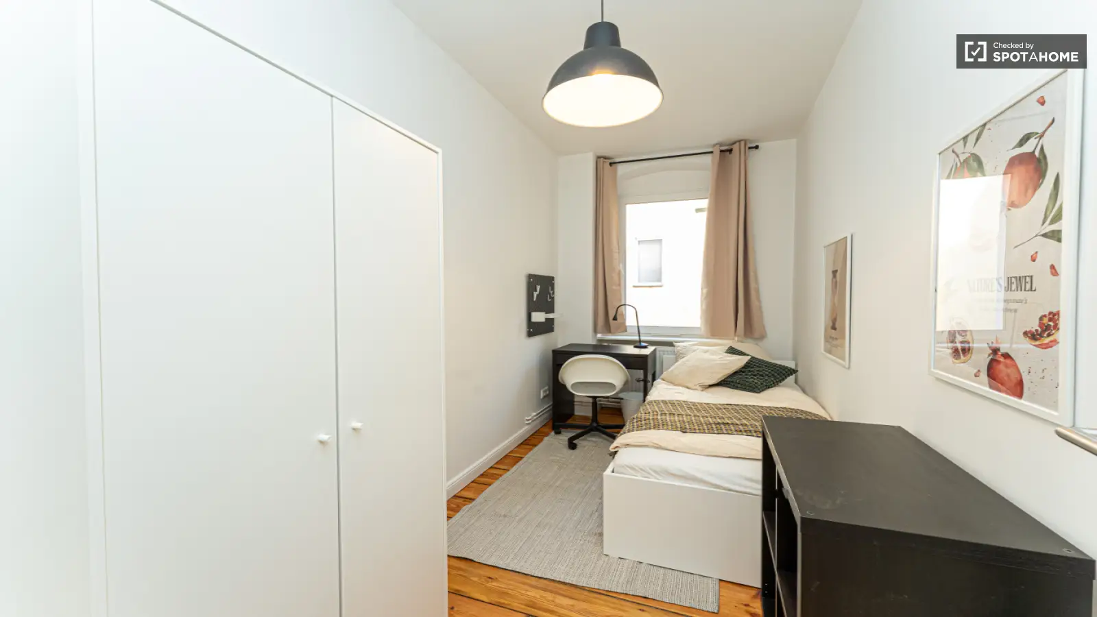 Find the perfect place to call home! This room is a cozy and inviting space located in a shared 3-bedroom apartment in Berlin. The room includes essential furnishings such as a single bed, a desk, shelving, and a standalone wardrobe. Please note that it's designed for single occupancy only and couples are not allowed. The room features heating and is exterior, providing a bright atmosphere. Spotahome ensures that all landlords undergo a vetting process for your safety and confidence.
