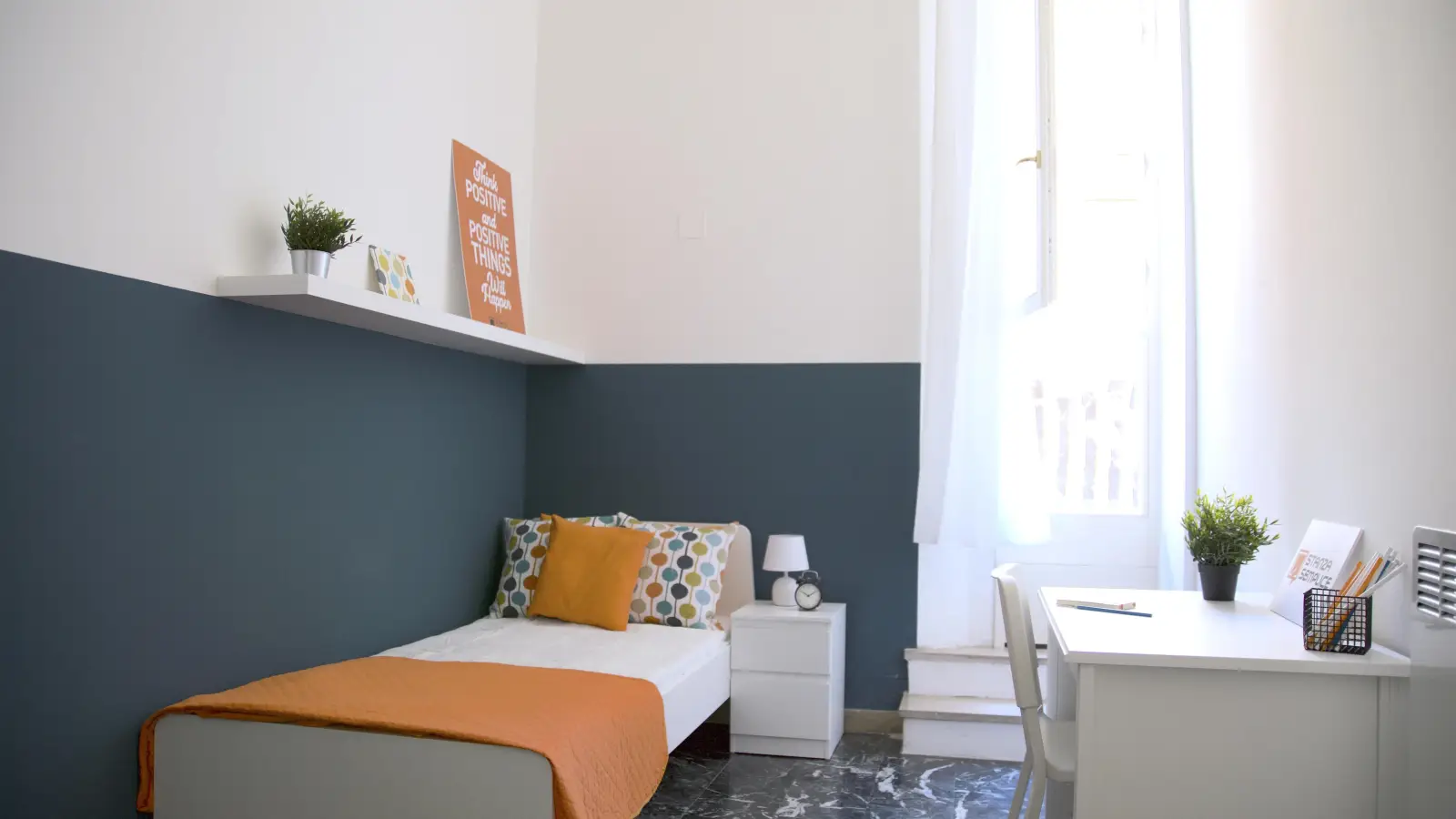 Zona Centro, posizione strategica e ambita, si affitta una bellissima suite Stanza Semplice ristrutturata appositamente per offrire comfort e comodità ai nostri studenti. La stanza è dotata di TV Led, letto piazza e mezza, armadio 3 ante, scrivania con portaoggetti, comodino, tendaggi, specchio, scarpiera, libreria. I colori delle pareti favoriscono il buon umore e aiutano nello studio.