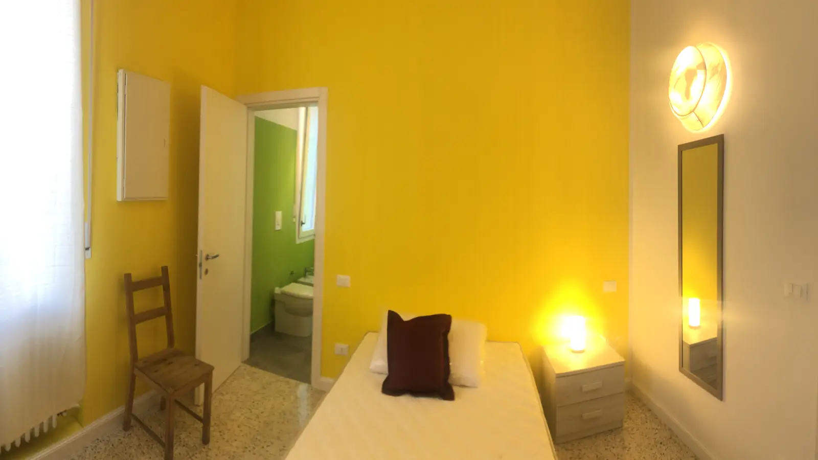 This room in a shared 4-bedroom apartment in Marconi, Bologna, is furnished and features an equipped kitchen, a dishwasher, an oven, and a shared balcony. All bills, including electricity, water, gas, and wifi, are included, providing a convenient renting experience. The property presents a comfortable and well-maintained environment for prospective tenants.