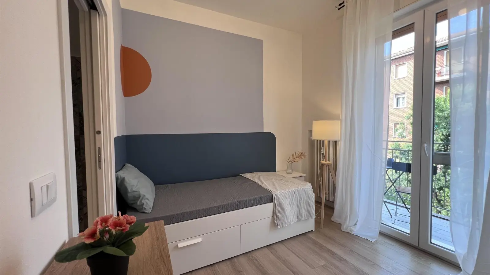 Zona Mazzini, posizione strategica e ambita, si affitta una bellissima suite Stanza Semplice con bagno privato completo ristrutturata appositamente per offrire comfort e comodità ai nostri studenti. La stanza è dotata di letto piazza e mezza, armadio 2 ante, scrivania con portaoggetti, comodino, tendaggi, specchio, scarpiera, libreria. I colori delle pareti favoriscono il buon umore e aiutano nello studio.