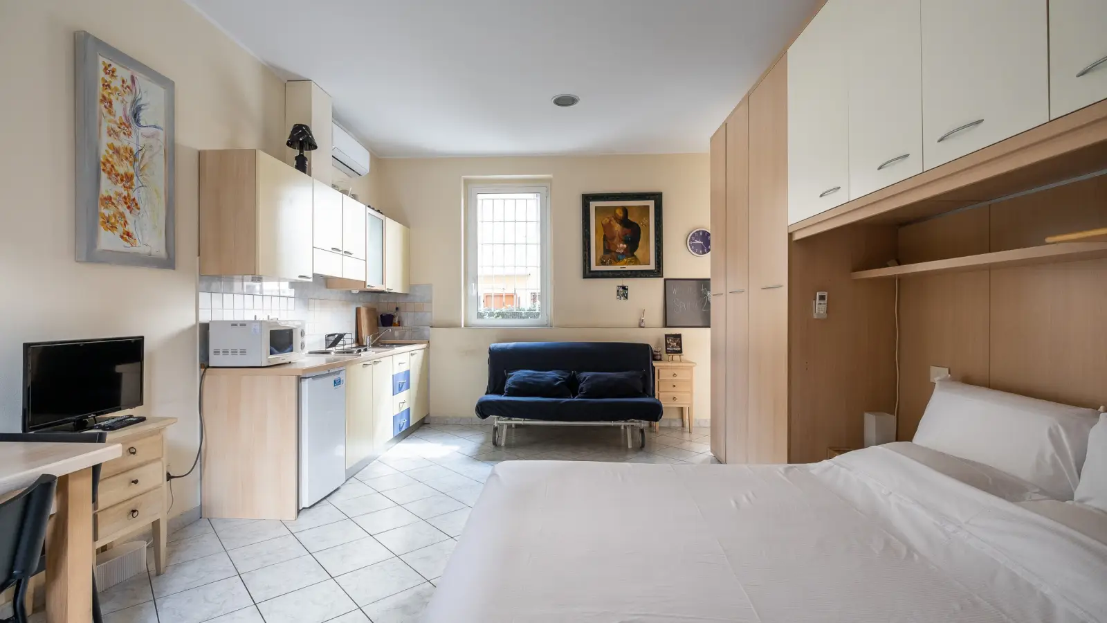 This furnished studio in Malpighi, Bologna offers an air-conditioned environment with individual units, a fully equipped kitchen, and a balcony for added convenience. It is suitable for professionals, students, and couples. Please note that Internet is included, but some utilities are extra.