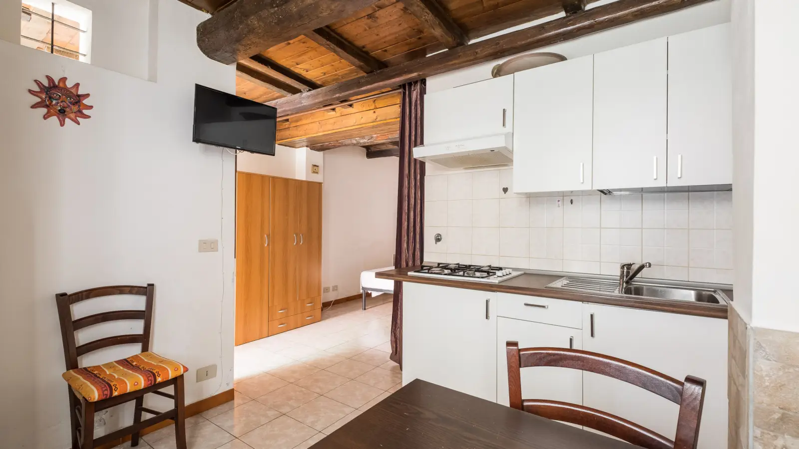Discover this well-furnished studio for rent in Zona Universitaria, Bologna. Suitable for professionals, couples, and students, this rental offers a fully equipped kitchen, comfortable furnishings, and a television. Note that smoking and pets are not allowed.