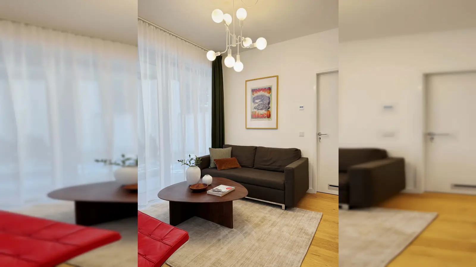 Der Raum: Bodentiefe Glastüren öffnen das Wohnzimmer vollständig zur Terrasse und durchfluten das Apartment von morgens bis abends mit natürlichem Licht. Das Apartment ist komplett mit ausgewählten Designerstücken eingerichtet – von markanten Leuchten über Walnusstische bis hin zu liebevollen Details.