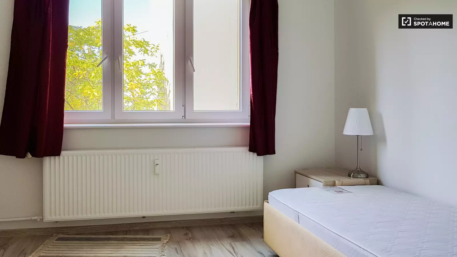 Schlafzimmer 2 ist mit einem Einzelbett, einer Zentralheizung und einem Schreibtisch mit Stuhl ausgestattet. Es bietet auch eine eigenständige Garderobe und kann mit einem unabhängigen Schlüssel erreicht werden. Dieses Zimmer verfügt über ein großes Fenster, durch das viel natürliches Licht hereinkommt. Dies ist ein heller und offener Raum.