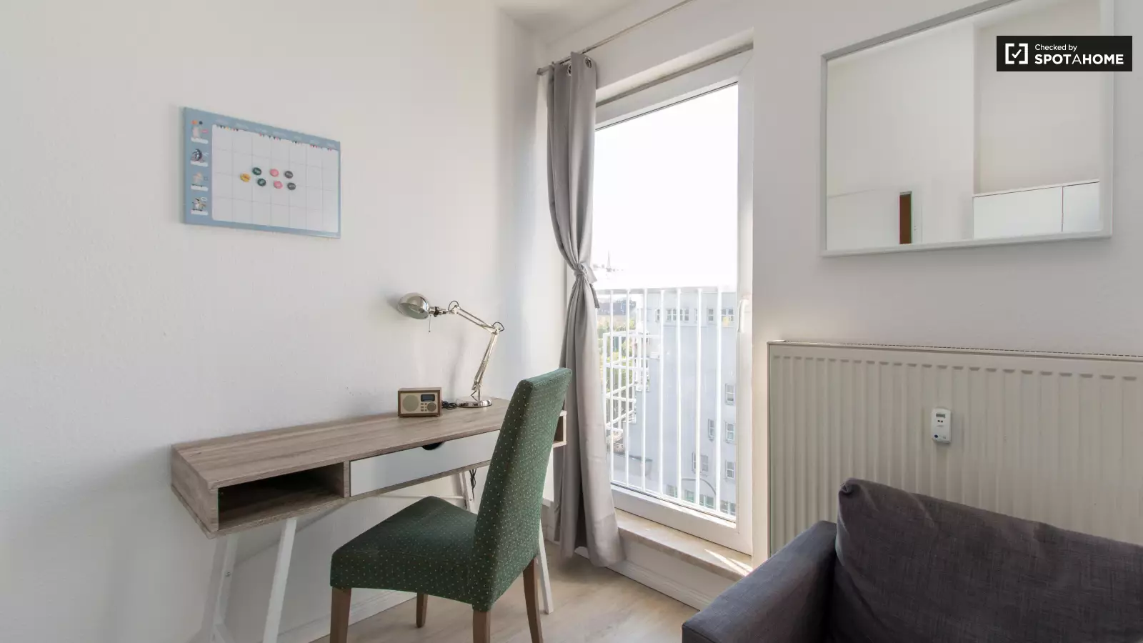 Schlafzimmer 2 kommt mit einem großen unabhängigen Kleiderschrank mit Schubladen und einem Spiegel an der Seite. Es hat ein Einzelbett gegenüber dem großen Fenster. Es gibt auch einen Schreibtisch und einen Stuhl.