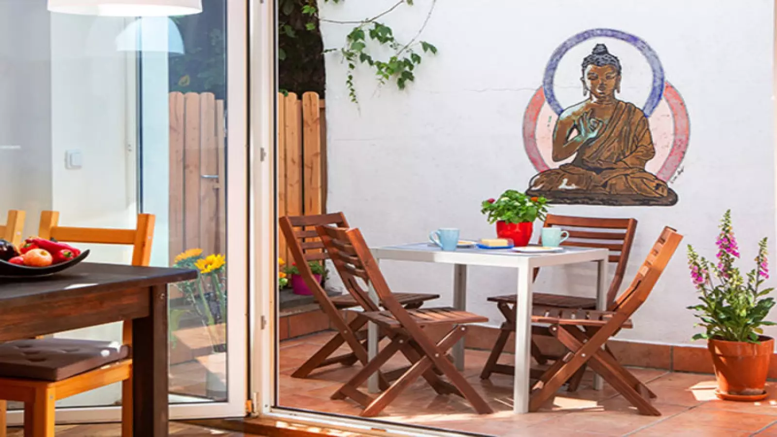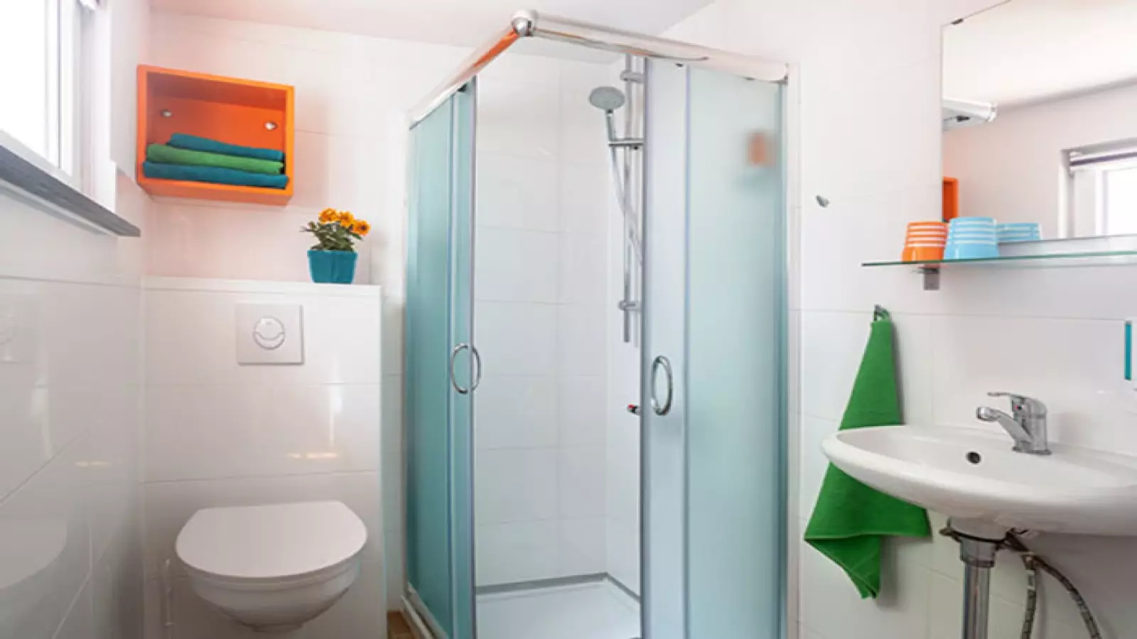 Im ersten Stock - 30 qm für bis zu 4 Personen - kostenloses WLAN - Wandheizung - Wohnzimmer mit Doppelbett (160 cm), Schlafsofa (140 cm), Schrank, Esstisch, Bügeleisen, Musikanlage, Smart-TV - Küchenzeile mit Kühlschrank, Toaster, Wasserkocher, Tee, Kaffeemaschine, Kaffeepads, Herd mit Cerankochfeld, Mikrowelle - Duschbad mit Handtüchern, Fön, Seife und Shampoo, kleine Terrasse im Innenhof.