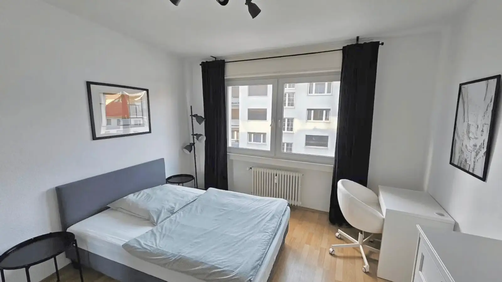 Das Apartment ist ausgestattet mit einem Kingsize-Boxspringbett mit hochwertiger Bettwäsche, zwei Nachttischen, einer Stehlampe, einer Kommode, einem großen Kleiderschrank, moderner Kunst und einem Schreibtisch mit passendem Stuhl. Alle Fenster verfügen über Verdunkelungsvorhänge, sodass das Apartment vollständig abgedunkelt werden kann. Außerdem gibt es eine kleine Küche mit allen notwendigen Kochutensilien. Nicht zuletzt bietet das Apartment ein exklusives Badezimmer mit Dusche und einem eleganten Spiegelwaschbecken.
