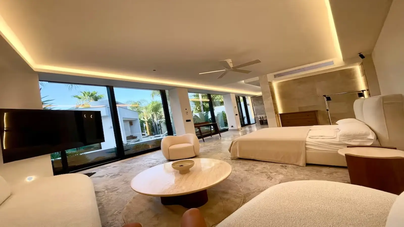 DORMITORIO PRINCIPAL: Cama King size bed de 180x200m, armario abierto, persianas eléctricas. Sábanas y toallas para la piscina, disponibles.