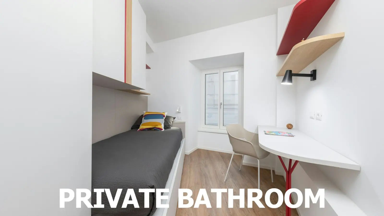 Minerva Student Hotel – Studieren, Leben, Entdecken! 24 Studenten, 24 Einzelzimmer mit Bad, 2 Schritte von den Fakultäten entfernt. Dieses komfortable Zimmer kombiniert die Privatsphäre einer exklusiven Umgebung mit allen Dienstleistungen eines Wohnheims ausschließlich für Studenten. Es wurde für die Bedürfnisse derjenigen eingerichtet, die viele Stunden mit Lernen verbringen müssen, und verfügt über einen geräumigen Schreibtisch mit einer schönen Lampe, einen Stuhl zum bequemen Lesen, ein Bücherregal und einen großen Kleiderschrank mit Schubladen.