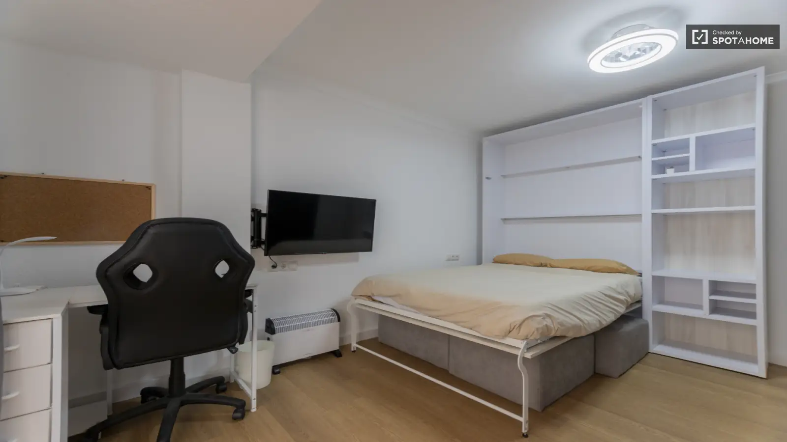 Apartment Overview: This bright and spacious apartment features five private bedrooms, a fully equipped kitchen, and two modern bathrooms. It is an excellent choice for students who want comfort, privacy, and convenience. The apartment is located just steps from Ruzafa, one of Valencia’s most vibrant districts, where you will find cafés, bars, restaurants, pharmacies, and all essential services. It sits in Mont Olivete, a quiet and safe neighborhood that is also very central, offering peace of mind together with excellent accessibility. With modern amenities and a welcoming atmosphere, the apartment is ideal for student living. Room 1: This cozy and well-lit room includes an elevated single bed, a study desk with an ergonomic chair, a comfortable sofa with a smart TV, and a spacious wardrobe. The private balcony brings in sunlight and fresh air, creating an inviting environment that works well for both focused study and relaxed downtime. Room 2: This is the largest room in the apartment and offers a bright and spacious layout. It includes a comfortable double bed, a study desk with an ergonomic chair, a cozy sofa with a smart TV, and a generous wardrobe. The southeast-facing window fills the room with natural light throughout the day. A small coffee table adds a convenient space for private meals or quiet moments. This room is ideal for students who want extra space and comfort. Room 3: This practical and comfortable room features a double bed, a study desk with an ergonomic chair, a smart TV, and a large built-in wardrobe that provides excellent storage while keeping the room uncluttered. It also includes a private terrace facing the internal patio. The terrace is furnished with a table and seating and offers an additional space that you can use in whichever way suits you best. Room 4: This well-organized and cozy room includes an elevated single bed, a study desk with an ergonomic chair, a comfortable sofa with a smart TV, and a spacious wardrobe. Thanks to its good natural light and efficient layout, it provides a calm and practical environment for both studying and resting. Room 5: This bright and spacious room includes a comfortable double bed, a study desk with an ergonomic chair, a large wardrobe, and a smart TV. It also has a private terrace equipped with outdoor seating and a table. The terrace brings in generous natural light and offers a pleasant space to enjoy fresh air or quiet moments, creating a balanced environment for both study and relaxation. Nearby Highlights:  • Ruzafa Center (~15 min walk): A lively area filled with cafés, restaurants, cultural venues, and local shops — ideal for social life and everyday needs.  • La Ciudad de las Artes y las Ciencias (~15 min walk): Perfect for cultural visits, cycling routes, and weekend activities.  • Roig Arena (~15 min walk): Valencia’s new multipurpose venue for concerts, sports, and major events. Transport Connections:  • Bus Line 6 (~3 min walk, every 10–15 min): Direct access to key destinations including university campuses (UV, CEU) in ~25 minutes, Malvarrosa Beach in ~25 minutes, and the City Center (Plaza del Ayuntamiento) in ~15 minutes.  • Mont Olivete Tram Stop (~5 min walk): Frequent service connecting you efficiently with multiple parts of the city.