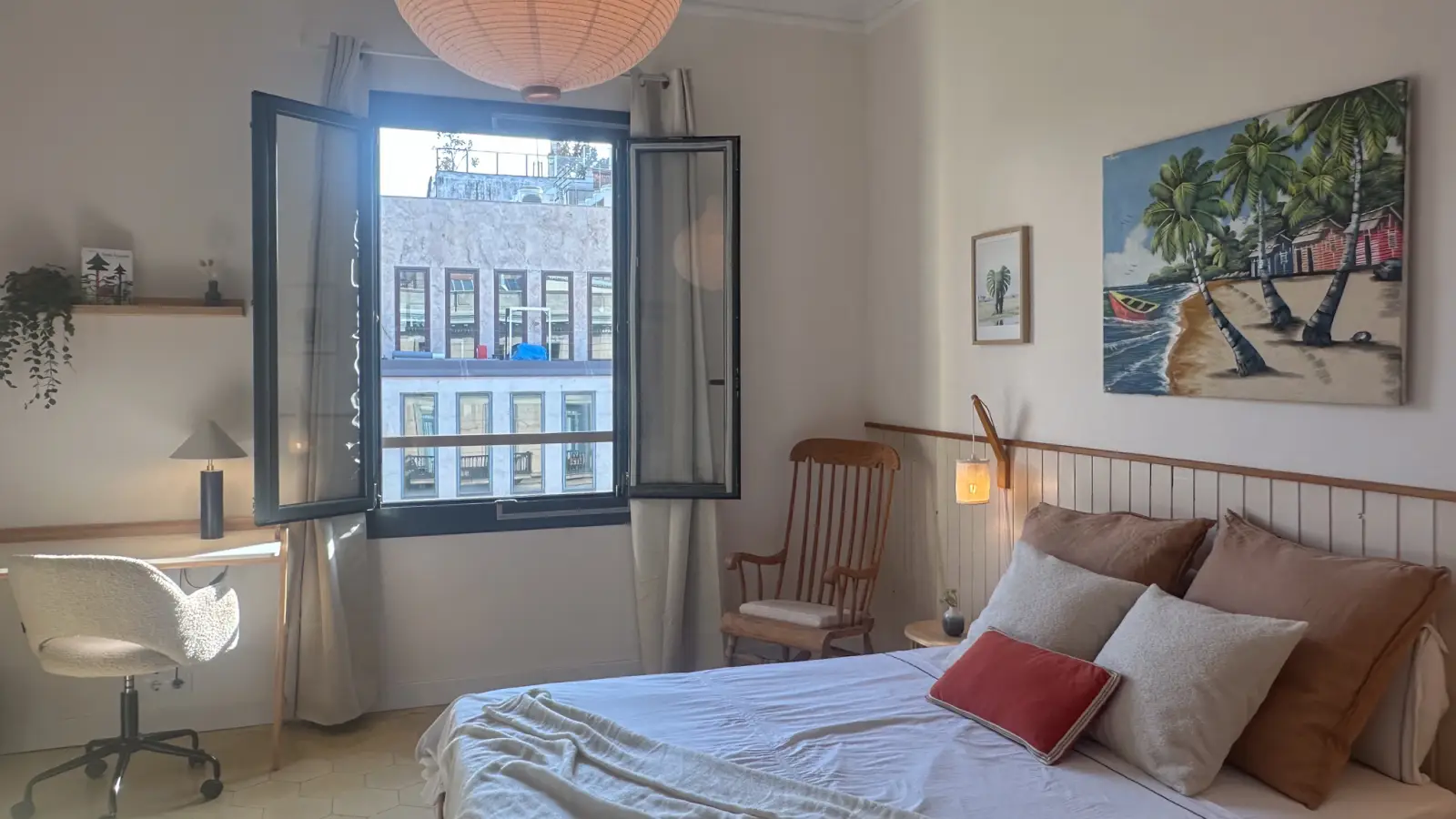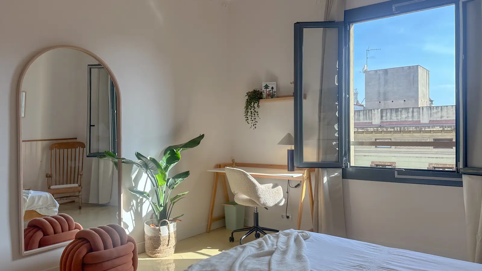 Esta habitación en un piso compartido de 8 habitaciones en la Dreta de l'Eixample es ideal para quienes buscan comodidad y practicidad. El piso está equipado con aire acondicionado individual, calefacción de gas natural, ascensor y comodidades como lavavajillas, horno y cocina equipada. Se permite fumar en el apartamento y se admiten parejas, profesionales y estudiantes.