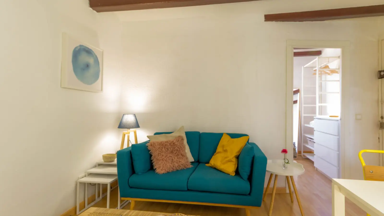 Este elegante estudio en Sant Antoni, Barcelona, está completamente amueblado y cuenta con comodidades modernas, como cocina equipada y balcón privado. Aunque el edificio no dispone de ascensor ni aparcamiento, el aire acondicionado individual garantiza su comodidad. Las facturas de luz, agua y wifi están incluidas, con algunas limitaciones.