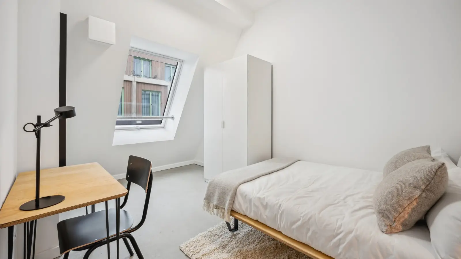 Nuestras habitaciones están completamente amuebladas con todo lo necesario para una vida cómoda. En el dormitorio encontrará una cama con mesita de noche y lámpara, además de un amplio armario. También se incluye un colchón de alta calidad con juego de sábanas, almohadas y edredones. Para trabajar o estudiar cómodamente desde casa, dispone de una mesa con lámpara y silla. No necesitará nada más para acomodarse y podrá llegar con solo su equipaje.