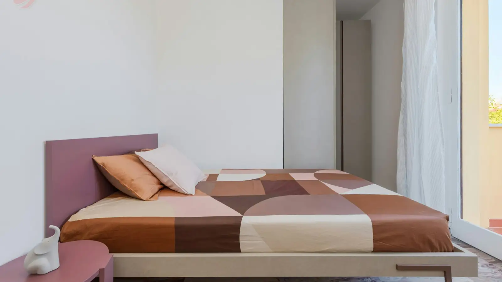Esta sala ofrece un ambiente acogedor y cuidadosamente organizado. La cama tamaño queen, equipada con un somier y un colchón ortopédico, garantiza un descanso confortable. Al lado hay una mesa redonda, perfecta para colocar libros o bebidas. El armario esquinero con cajones interiores ofrece mucho espacio para la ropa. El escritorio de 135 x 60 cm, complementado con la cómoda silla BABILA Pedrali, crea un espacio ideal para estudiar o trabajar productivamente. Para añadir un toque final de tranquilidad, el balcón ofrece un lugar perfecto para relajarse y disfrutar del aire libre.