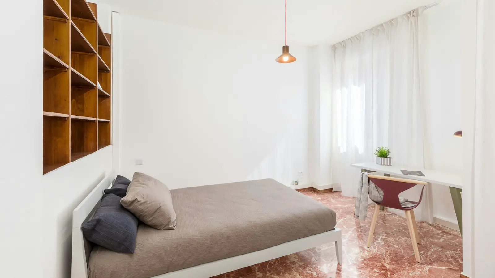 La habitación más grande de este apartamento cuenta con un magnífico suelo de mármol rojo, que aporta un toque de elegancia inigualable. Como el resto de habitaciones, esta habitación ha sido especialmente diseñada para estudiantes, teniendo en cuenta sus necesidades. Encontrarás un amplio escritorio de 135 cm, perfecto para estudiar cómodamente y disponer de todo el espacio que necesitas. La silla Fox Pedrali, de diseño ergonómico, te garantizará una postura correcta y te ayudará a prevenir dolores de espalda. El armario de 3 puertas, integrado en el pasillo, te permitirá mantener tu habitación siempre ordenada, con amplio espacio para guardar tu ropa. La cama de matrimonio está equipada con un colchón ortopédico de alta calidad, que te ofrecerá el máximo confort y un sueño reparador. También encontrarás amplias estanterías, perfectas para organizar y exhibir tu colección de libros.