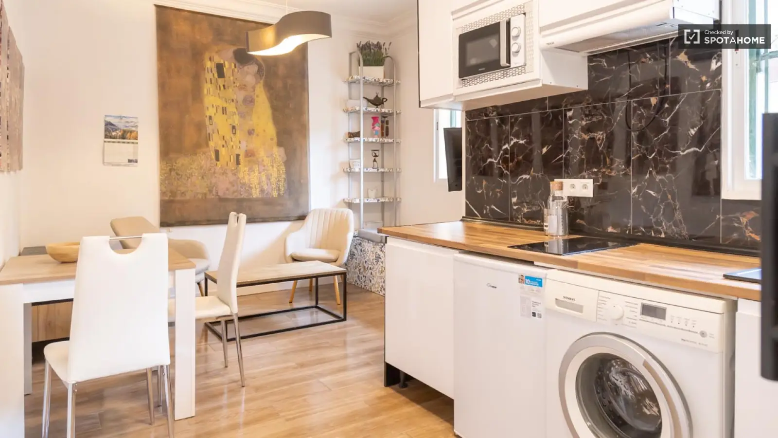Este apartamento amueblado de 1 dormitorio se encuentra en el barrio de Costillares, Madrid. La propiedad incluye aire acondicionado individual, lavadora, lavavajillas y cocina equipada. El apartamento ha sido verificado personalmente por un Homechecker de Spotahome, lo que garantiza que cumple con los estándares de calidad.