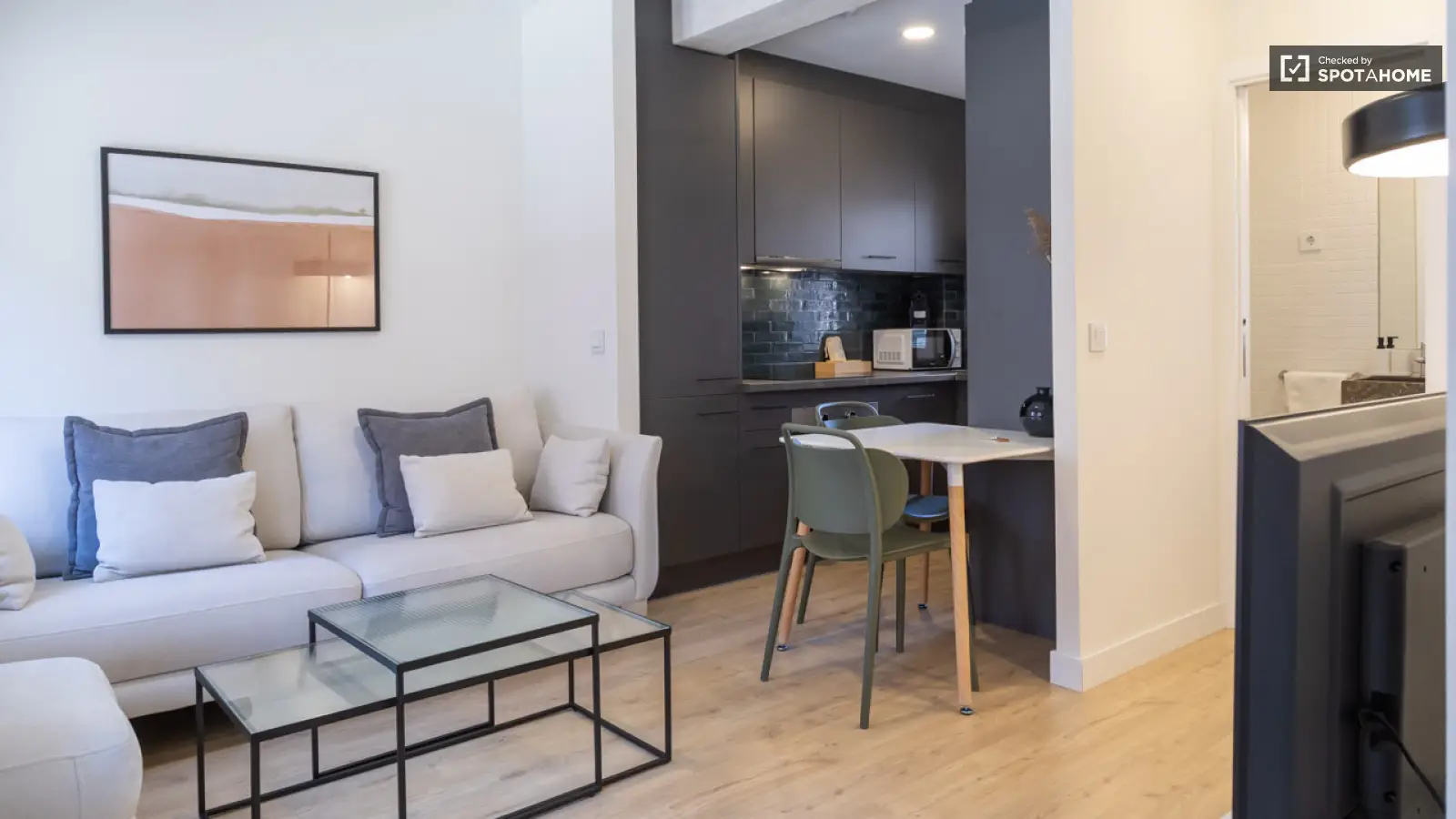 Este impresionante apartamento de 1 dormitorio en Almenara, Madrid, es perfecto para profesionales y estudiantes que buscan un espacio habitable totalmente equipado. Entre sus características destacan un balcón, aire acondicionado, lavadora, lavavajillas y horno. El apartamento tiene vistas al exterior y está completamente amueblado, garantizando una estancia confortable. Spotahome ha verificado personalmente esta propiedad para asegurar su calidad.