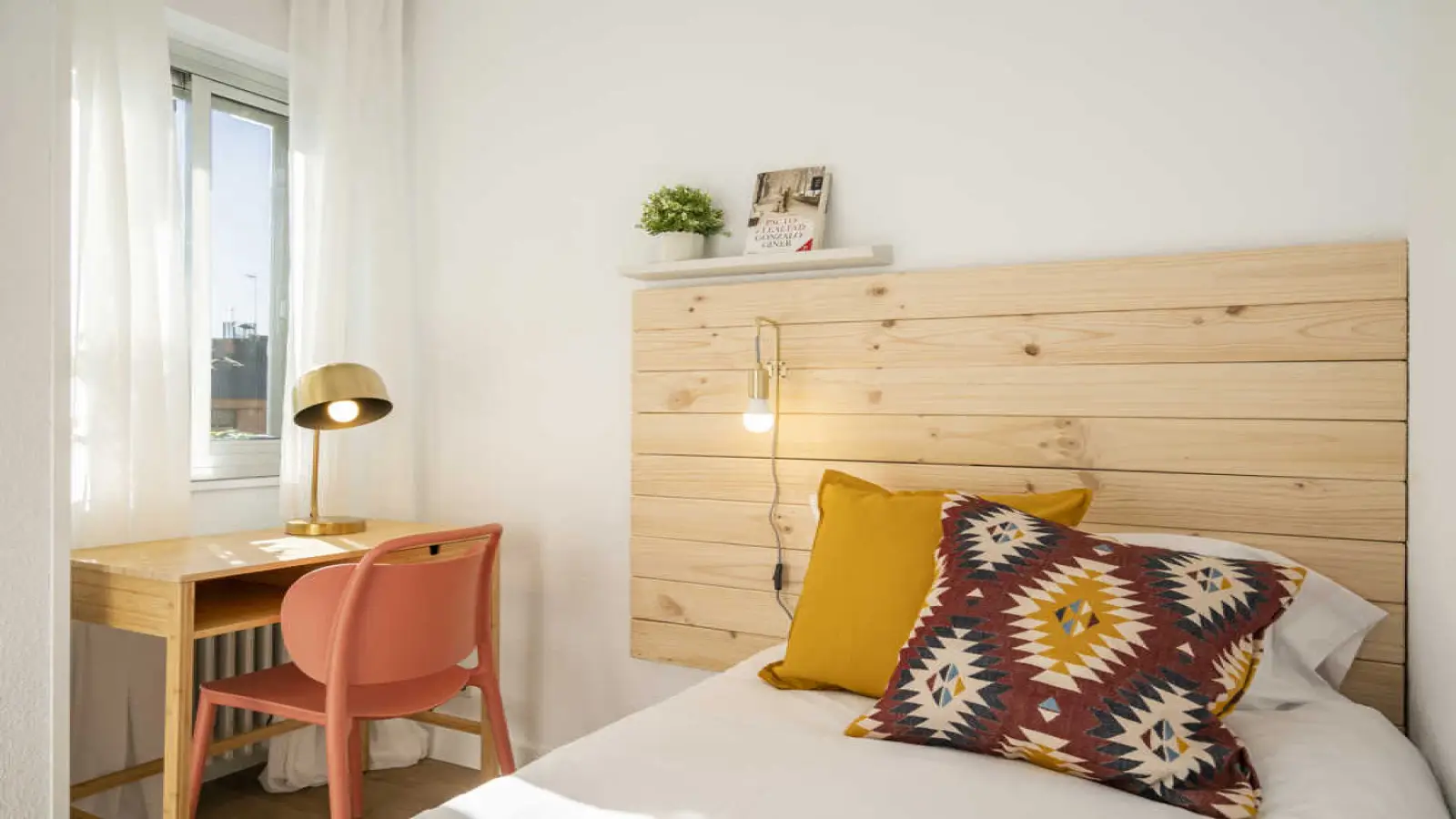 Habitación individual en piso compartido, compuesto por 16 habitaciones y 6 baños. De unos 9 m2 con cama de matrimonio y puesto de trabajo. Con wifi, terraza, lavavajillas, lavadora. Clase energética: G, IPE 0,00 Kwh/m2 año.