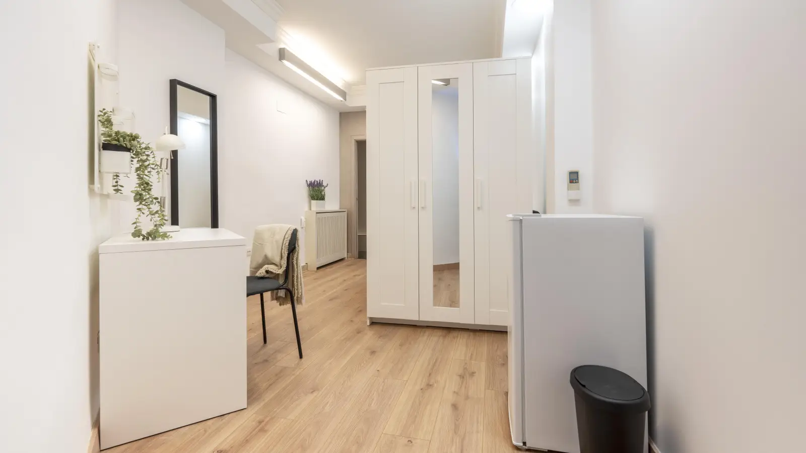 Esta habitación amueblada en un apartamento compartido de 5 habitaciones se encuentra en el animado barrio de Goya, en Madrid. La habitación cuenta con una cama doble, un escritorio, baño privado y un armario independiente. Además, dispondrá de una llave propia para su estancia.