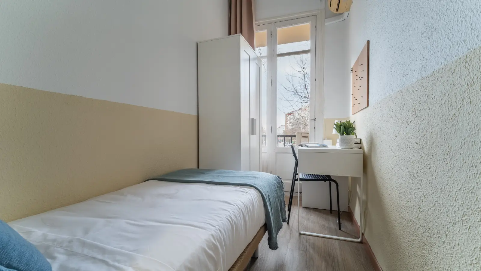 dormitorio exterior con un balcón y una cama individual, escritorio y armario.