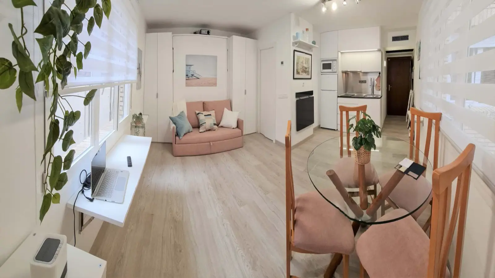 Características del estudio: - parquet - Cocina americana totalmente equipada. - Nevera con congelador independiente - Microondas - Lavadora A++ - Mobiliario de diseño - Armarios altos (4 puertas) + armario de limpieza. - Altillo con amplio espacio tipo maletero. - Cama muy cómoda 135×190, somier de láminas y colchón viscoelástico - Cama abatible para ganar espacio. - Mesa especial para ordenador (altura ergonómica) -Puerta de seguridad - Tendedero exterior