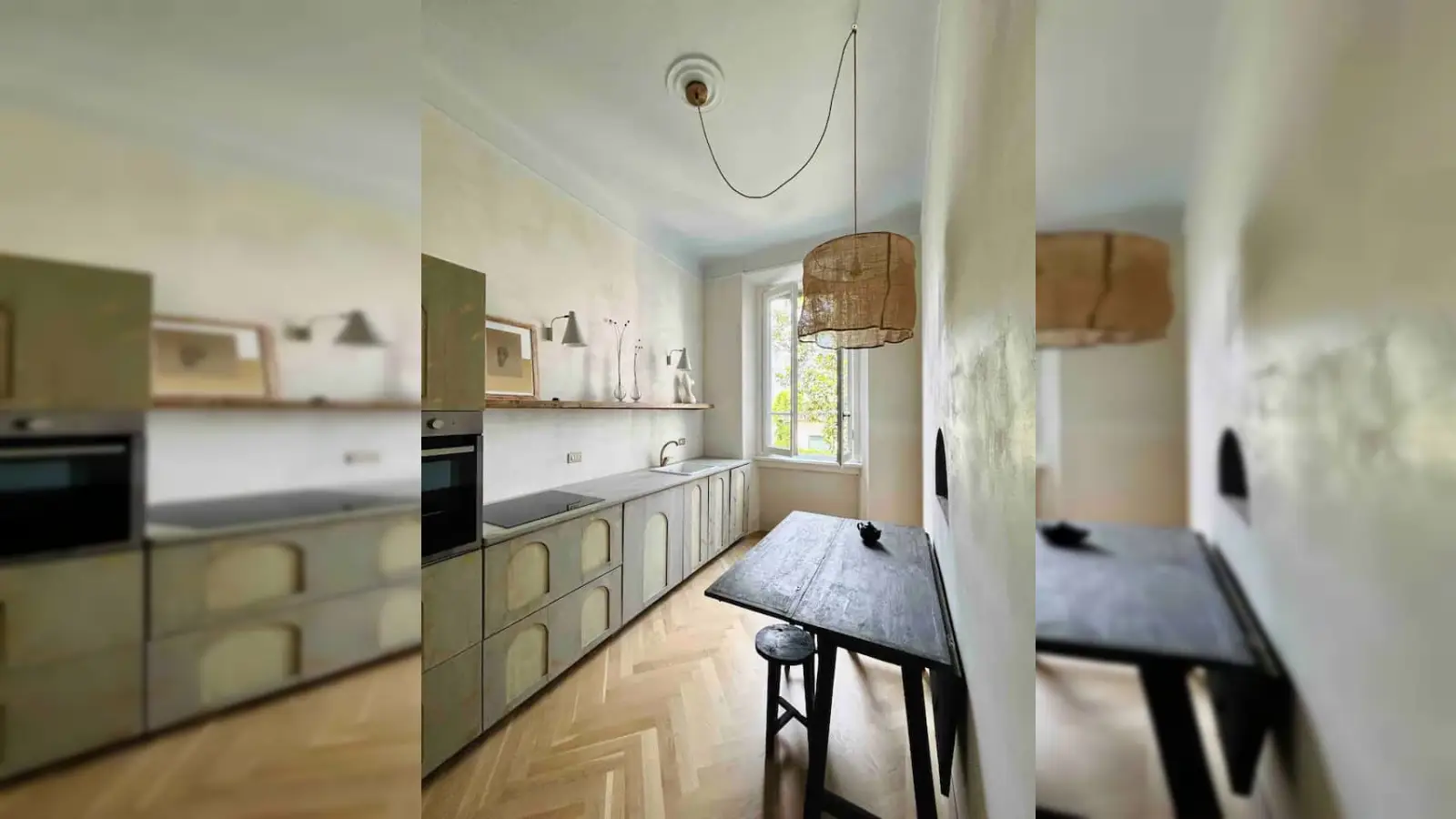 Los suelos de cemento de época, el parqué con colocación en espiga milanesa, las paredes con textura y los papeles pintados de diseño son algunas de las peculiaridades que caracterizan la arquitectura interior del apartamento.