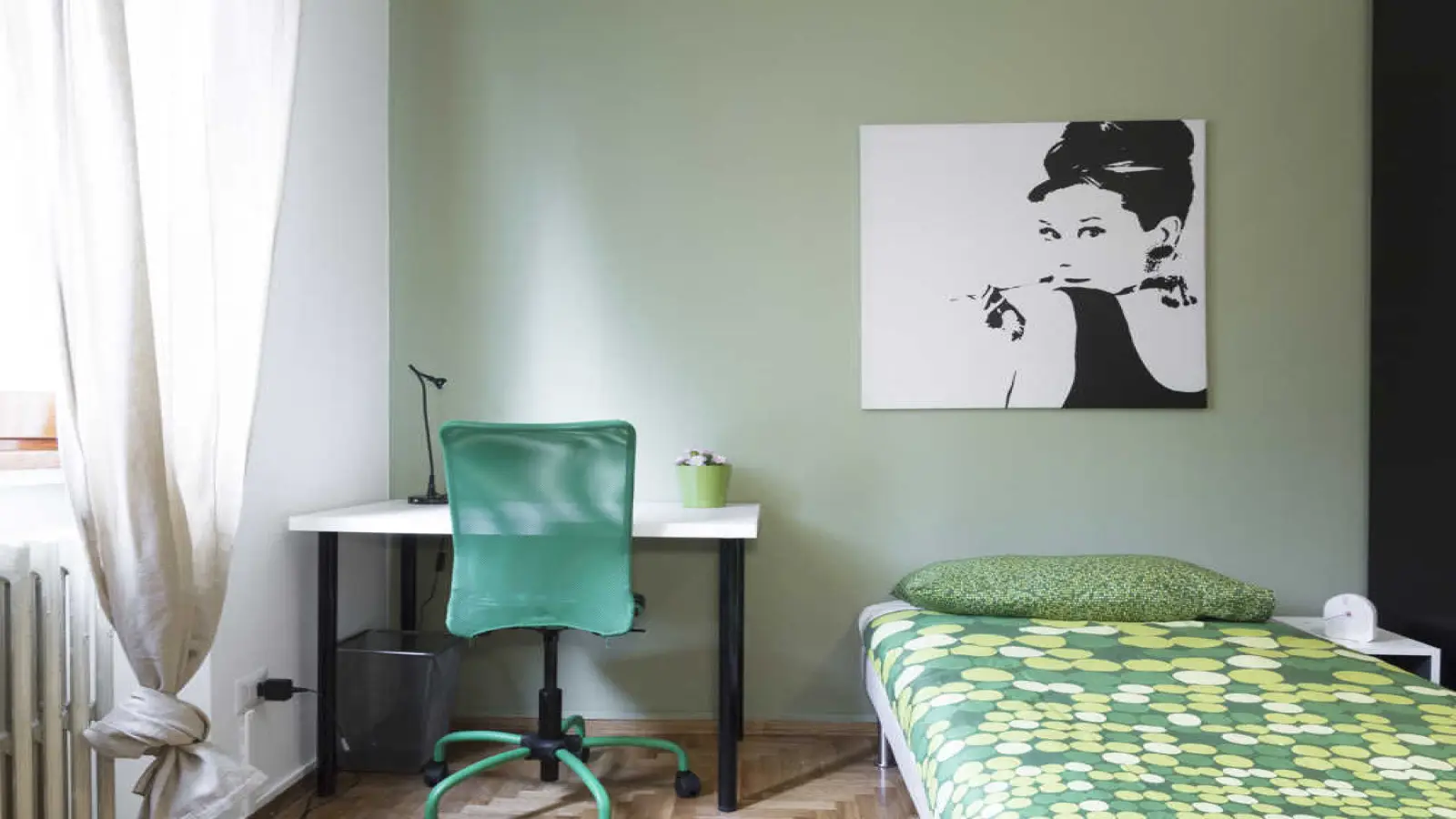 Habitación individual en piso compartido, compuesta por 2 habitaciones y 1 baño. De unos 18 m² con una cama individual y un puesto de trabajo. Con wifi, terraza, servicios de conserjería, lavavajillas, lavadora. Clase energética: G, IPE 272,83 Kwh/m² año.