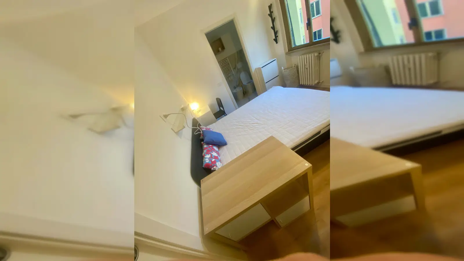 The suite is very large, with double-glazed windows that provide good thermal and acoustic insulation. It is furnished with: a comfortable double bed, two bedside tables, two large desks with ergonomic chairs for study or work, a large walk-in closet, a clothes rack, a shelf for books or personal items, a bookcase, and a large shelf unit, as well as a private bathroom. The apartment has double exposure: one facing the quiet internal courtyard and one facing the outside, allowing natural light to enter for most of the day.