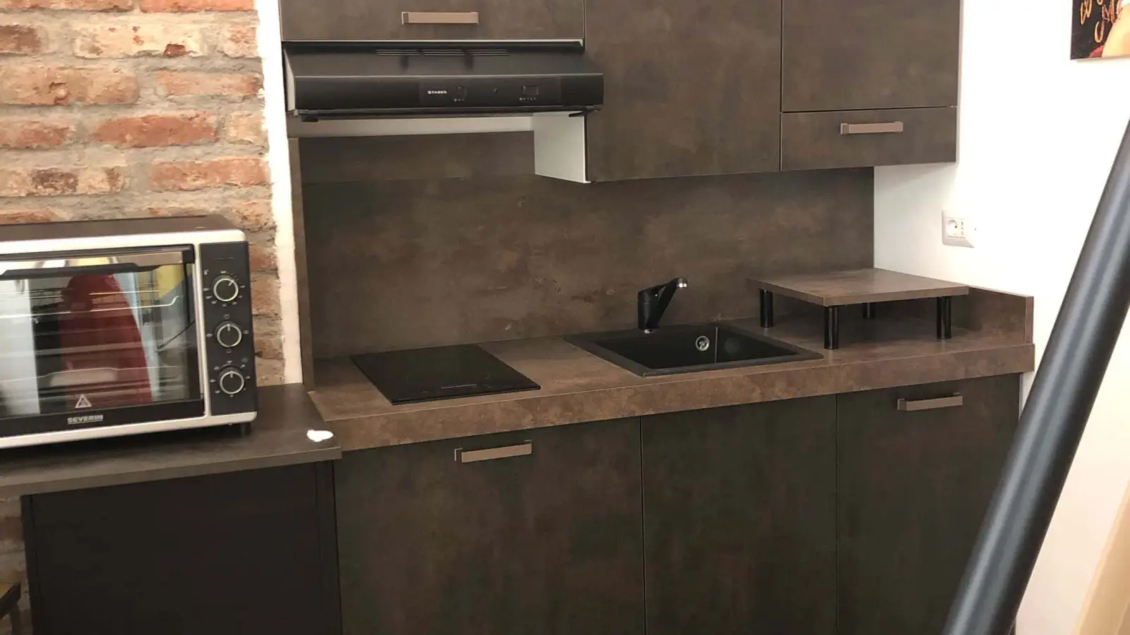 Cocina a medida con mesa para dos personas. Baño y antesala. Importante: No dispone de bidé. Aseo con ducha de mano. Ducha amplia. Ventana tipo loft muy alta. Equipado con aire acondicionado, placa de inducción, lavavajillas, lavadora, calentador eléctrico grande, refrigerador con congelador pequeño, horno, zapatero, estantería, impresora, dos sillones, calefactor eléctrico adicional y secador de pelo.