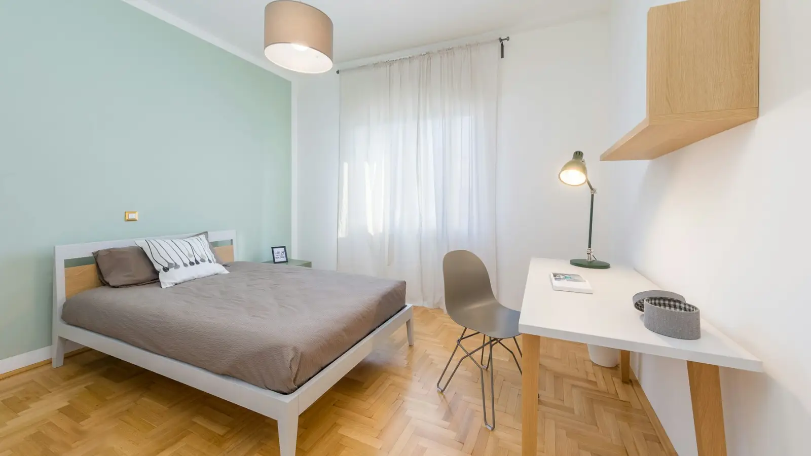 Habitación individual espaciosa y de estilo refinado, amueblada pensando específicamente en las necesidades de un estudiante: escritorio de 135 cm de ancho, estantería de 100 cm, silla Calligaris, cama de matrimonio con colchón ortopédico, armario de 3 puertas de 135 cm de ancho. Caracterizada por una pared verde salvia que calma, da frescura y elegancia, esta habitación es ideal para estudiantes exigentes, que buscan una solución espaciosa y cómoda donde pasar los mejores años de universidad.