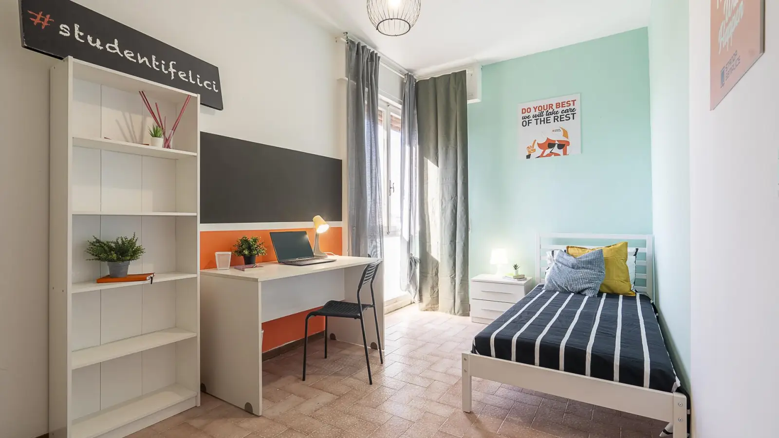 Zona polo Fibonacci, posición estratégica y ambita, si affitta una bellissima stanza singola Stanza Semplice ristrutturata appositamente per offrire comfort e comodità ai nostri Studenti. La estrofa è dotata di TV Led, letto singolo, armadio 3 ante, scrivania con portaoggetti, comodino, tendaggi, specchio,libreria. I colori delle pareti favoriscono il buon umore e aiutano nello studio.