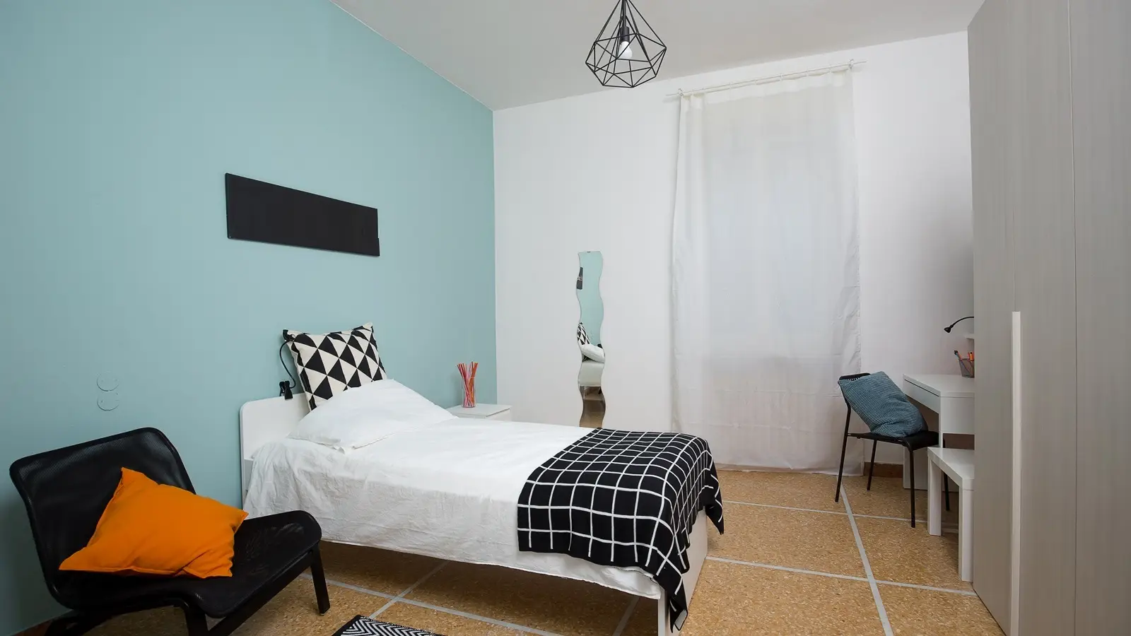 Zona Centro adyacente a Piazza Tre Martiri, posición estratégica y ambita, si affitta una bellissima suite Stanza Semplice ristrutturata appositamente per offrire comfort e comodità ai nostri Studenti. La estrofa è dotata di letto singolo, armadio 6 ante, scrivania con portaoggetti, comodino, tendaggi, specchio, libreria. I colori delle pareti favoriscono il buon umore e aiutano nello studio.