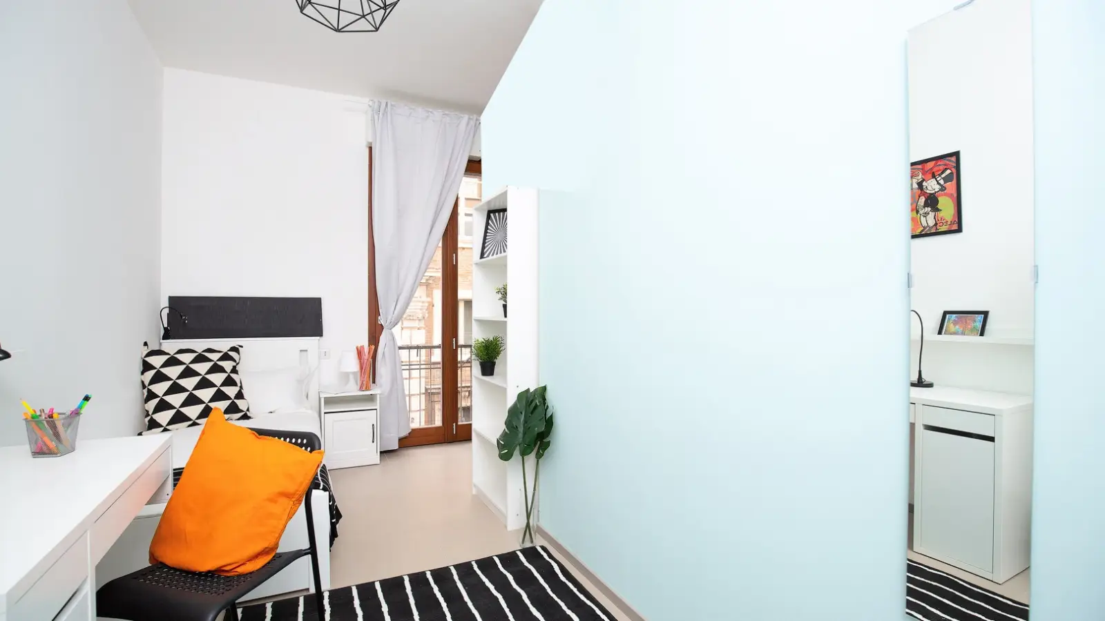 Zona Centro, posición estratégica y ambita, si affitta una bellissima stanza singola Stanza Semplice ristrutturata appositamente per offrire comfort e comodità ai nostri Studenti. La estrofa è dotata di letto singolo, armadio 3 ante, scrivania con portaoggetti, comodino, tendaggi, specchio, libreria. I colori delle pareti favoriscono il buon umore e aiutano nello studio.