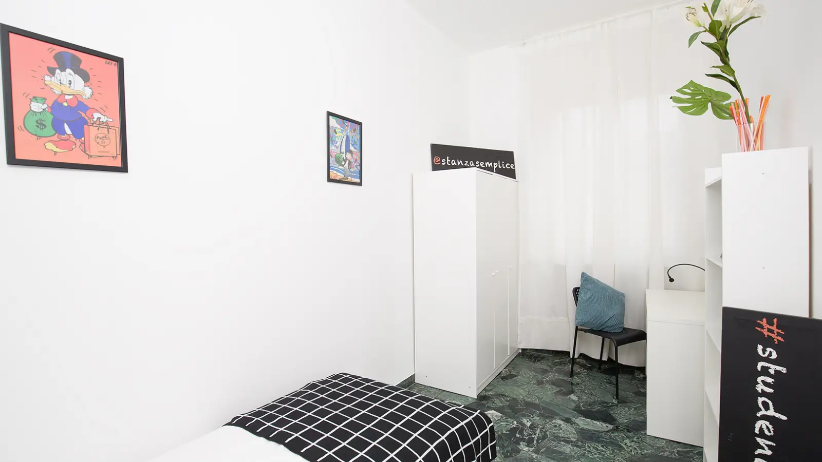 Zona Centro, posición estratégica y ambita, si affitta una bellissima stanza singola Stanza Semplice ristrutturata appositamente per offrire comfort e comodità ai nostri Studenti. La estrofa è dotata di letto singolo, armadio 3 ante, scrivania, comodino, tendaggi, specchio, libreria. I colori delle pareti favoriscono il buon umore e aiutano nello studio.