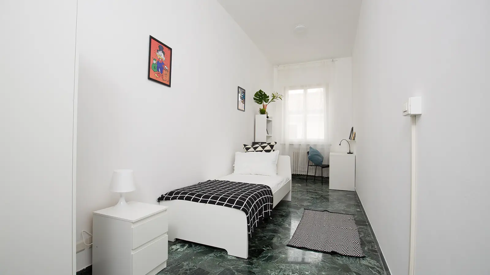 Zona Centro, posición estratégica y ambita, si affitta una bellissima stanza singola Stanza Semplice ristrutturata appositamente per offrire comfort e comodità ai nostri Studenti. La estrofa è dotata di letto singolo, armadio 3 ante, scrivania, comodino, tendaggi, specchio, libreria. I colori delle pareti favoriscono il buon umore e aiutano nello studio.