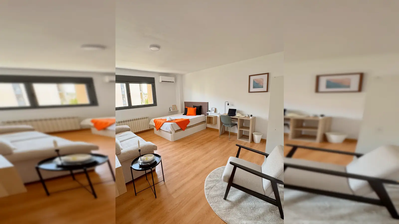 🛏️ Sobre la habitación ✔ Cama de 135 cm con canapé, perfecta para un descanso reparador ✔ Escritorio y mobiliario funcional para teletrabajar o estudiar. ✔ Ventana exterior que aporta gran luminosidad ✔ Ambiente tranquilo y acogedor, ideal para la concentración.