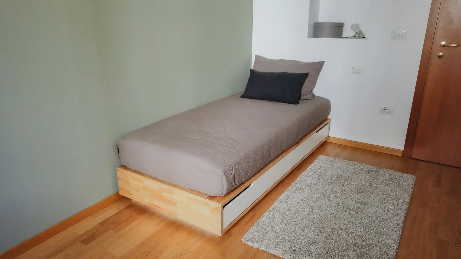 Habitación individual amplia con una pared color verde salvia que crea un ambiente sereno y relajado. Este delicado color y la madera natural del baúl evocan el estilo shabby chic, con su atmósfera romántica y etérea.