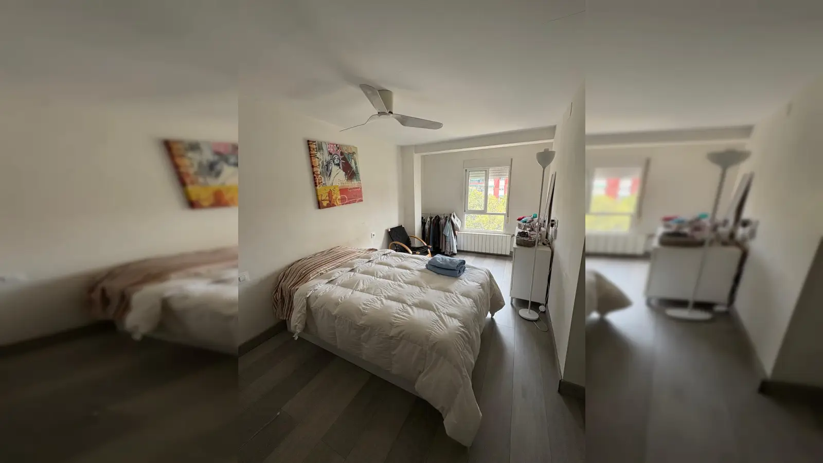 El dormitorio 1 es una habitación espaciosa que viene amueblada con una cama individual, un armario, estanterías y un escritorio que puedes usar para estudiar o comer. La habitación también tiene un ventilador para mantenerte fresco durante el verano. La habitación también es luminosa ya que tiene mucha luz natural.