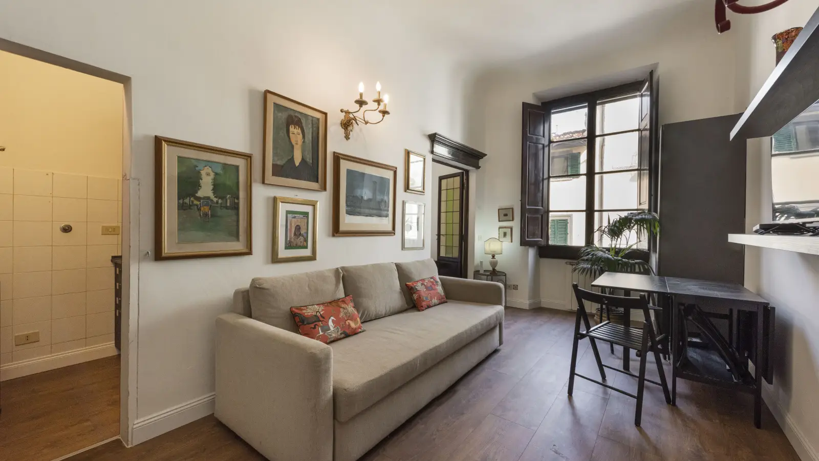 Welcome to our apartment for rent located in the heart of the historic center of Florence, in the charming Borgo Ognissanti district. This charming residence is a hidden gem, perfectly positioned just a few steps from the majestic Basilica of Santa Maria Novella and the picturesque Lungarni. The apartment offers a lively combination of convenience and comfort, with a spacious and welcoming distribution. Once you cross the threshold, you will immediately be greeted by a large and bright tastefully furnished living room, ideal for relaxing after a day spent exploring the beauties of Florence. There is also a comfortable sofa bed in the living room, ready to accommodate additional guests. The kitchen is well equipped, allowing you to prepare delicious breakfasts or tasty meals to spend pleasant moments with friends and family. The bathroom features a shower, ensuring maximum comfort and convenience during your stay. The bedroom, furnished with style, has a comfortable double bed, ensuring a regenerating rest for your daily adventures in Florence. The apartment can accommodate up to four people thanks to the double bed and the sofa bed in the living room. Located on the first floor and served by a lift, the apartment offers easy access, making your stay even more enjoyable. For your comfort, the apartment is equipped with Wi-Fi and a washing machine, so you can stay connected with the world and keep your clothes fresh. There's no better starting point for exploring Florence, with its timeless works of art, historical treasures and vibrant culture. Be our guest in this welcoming apartment, where you can experience the authentic Florentine experience in all its glory. Contact us today to book your dream stay in Florence, in the magical atmosphere of Borgo Ognissanti!