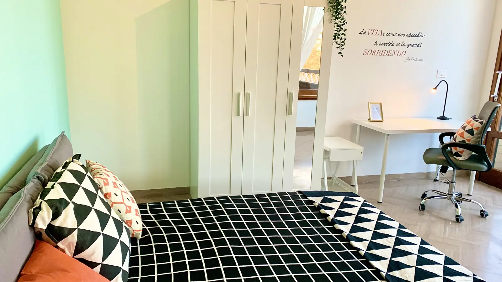 Accogliente e luminosa camera, completamente arredata, con balcone privato e vista panoramica della città (si vede anche il Duomo), letto singolo e Wi-Fi (connessione Internet veloce - Fibra). Gli inquilini sono per lo più studenti, ragazzi e ragazze, tutti giovani, italiani e internazionali. L'appartamento è ben collegato al centro città, in posizione tranquilla; tutti i servizi sono nelle vicinanze (supermercati, banche, bar tabacchi, ecc.). L'appartamento, al quarto piano con ascensore, oltre alle camere da letto, dispone di due bagni e di una cucina attrezzata con due frigoriferi, fornelli, forno e forno a microonde; il tutto arredato con mobili nuovi ed è fornito di pentole, piatti, posate, ecc. le foto al momento sono esempi poichè l'appartamento è in fase di ristrutturazione, le foto effettive saranno pubblicate a fine gennaio