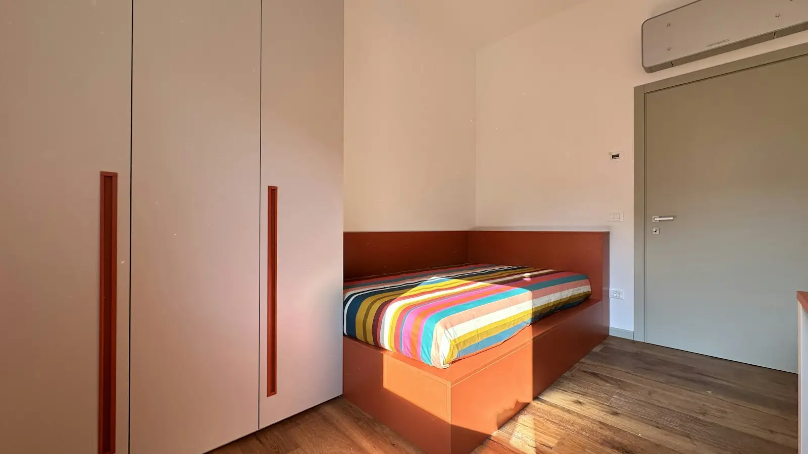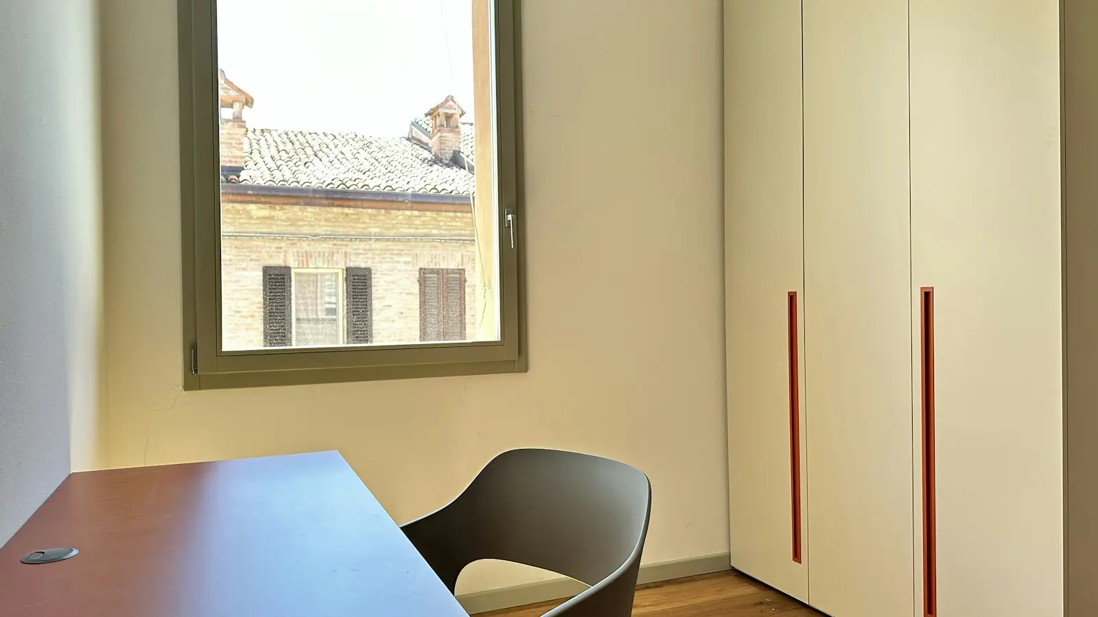 Dans cette chambre, vous trouverez un lit super confortable avec un matelas orthopédique, une table de chevet à deux tiroirs, une grande armoire à trois portes et un bureau spacieux avec une chaise Babila Pedrali.