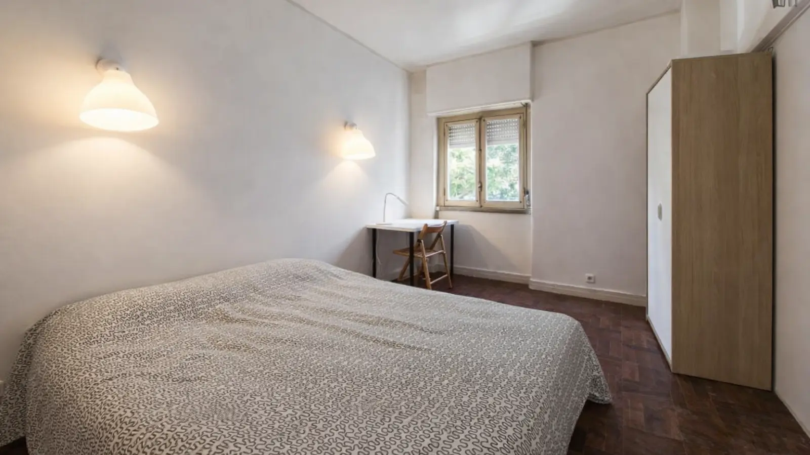 Confortablement meublée avec un grand lit double, cette magnifique chambre comprend également une armoire autonome, de nombreuses étagères pour vos effets personnels et vos vêtements, ainsi qu'un joli bureau avec une chaise placée sous la fenêtre de la pièce.